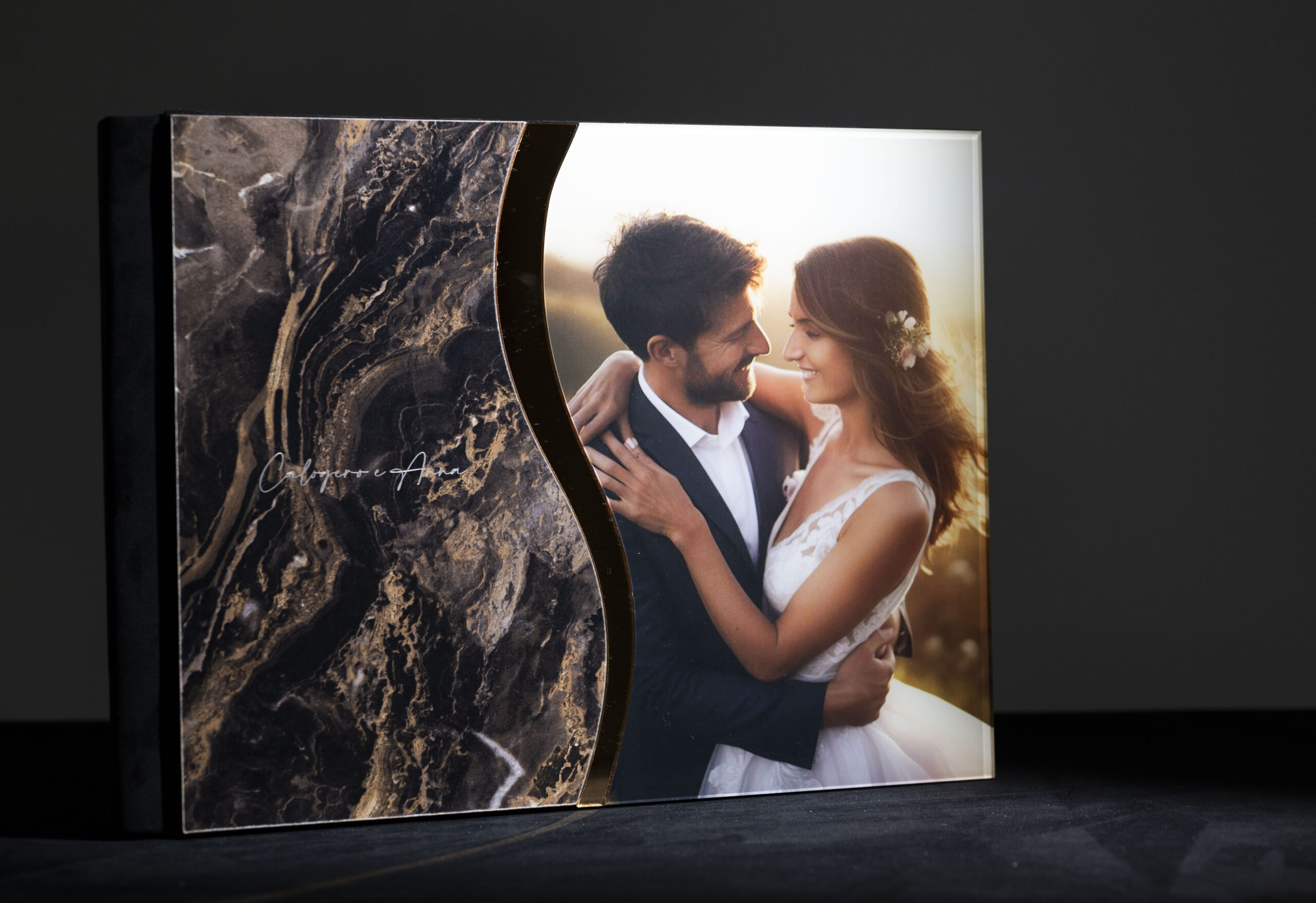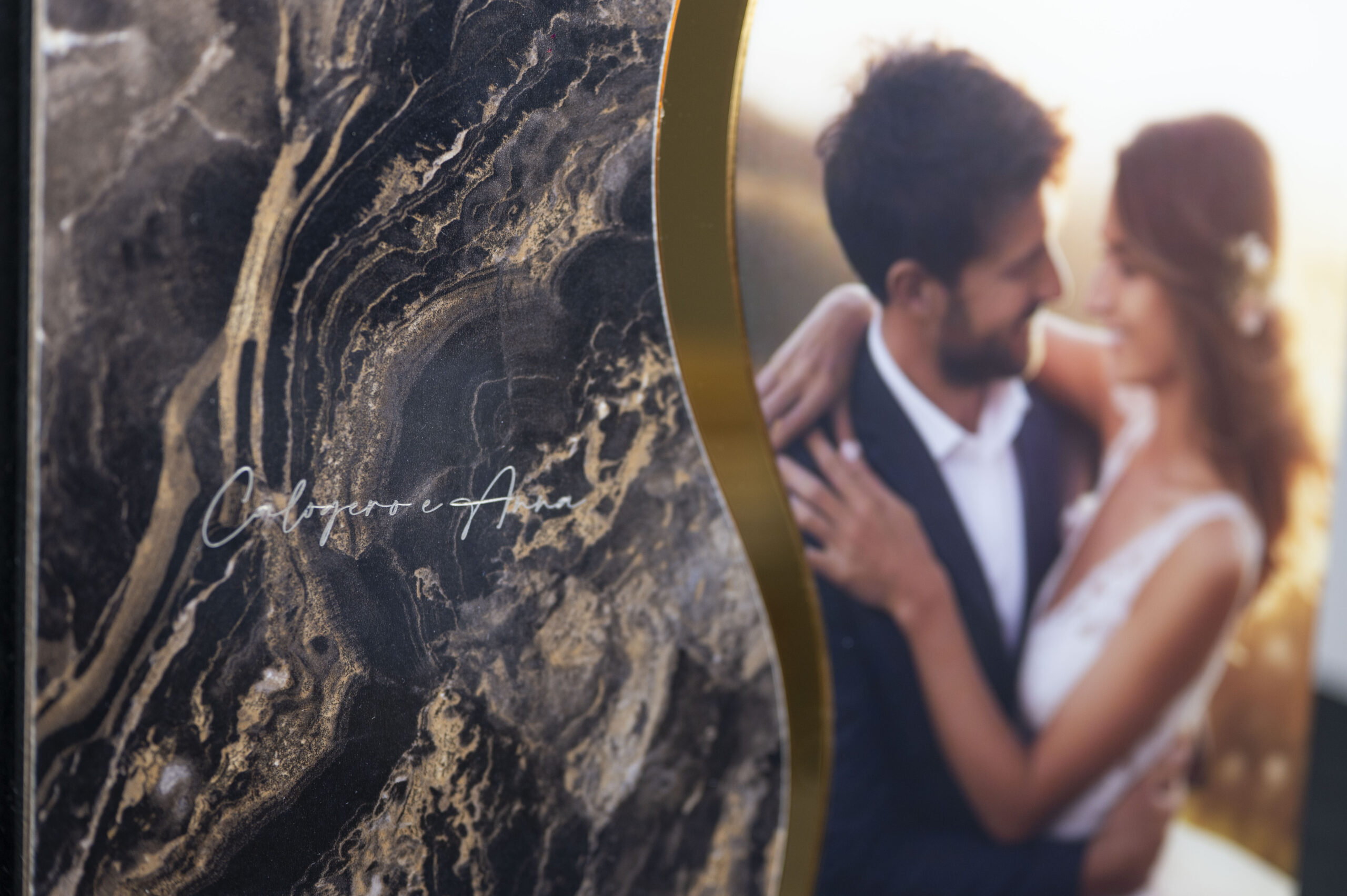 Questo album di matrimonio è una fusione di lusso e romanticismo, con una copertina caratterizzata da un’elegante texture effetto marmo nero e oro. Una sinuosa fascia dorata separa questa texture da una fotografia vibrante della coppia di sposi, mentre la scritta personalizzabile aggiunge un tocco personale e sofisticato. È l’oggetto perfetto per custodire i ricordi preziosi del matrimonio con uno stile moderno e distintivo