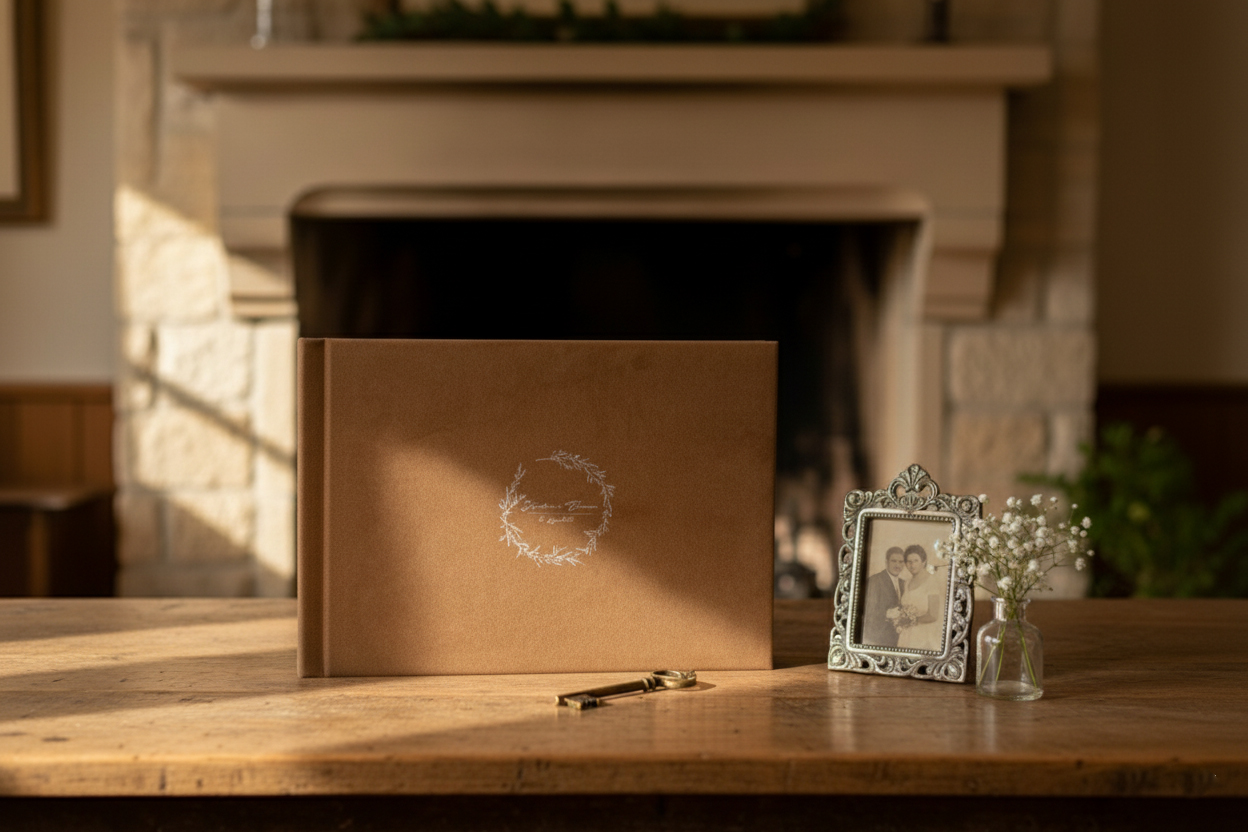 Questo album di matrimonio incarna un’eleganza naturale e rustica, perfetta per un evento romantico. La sua copertina è interamente rivestita in un tessuto flock. Al centro della copertina, un motivo floreale stilizzato e delicato, in rilievo stampato in un colore tenue, incornicia i nomi personalizzabile e la data personalizzabile. È un oggetto che unisce la semplicità dei materiali naturali con un tocco di romanticismo, ideale per custodire i ricordi più preziosi del grande giorno.