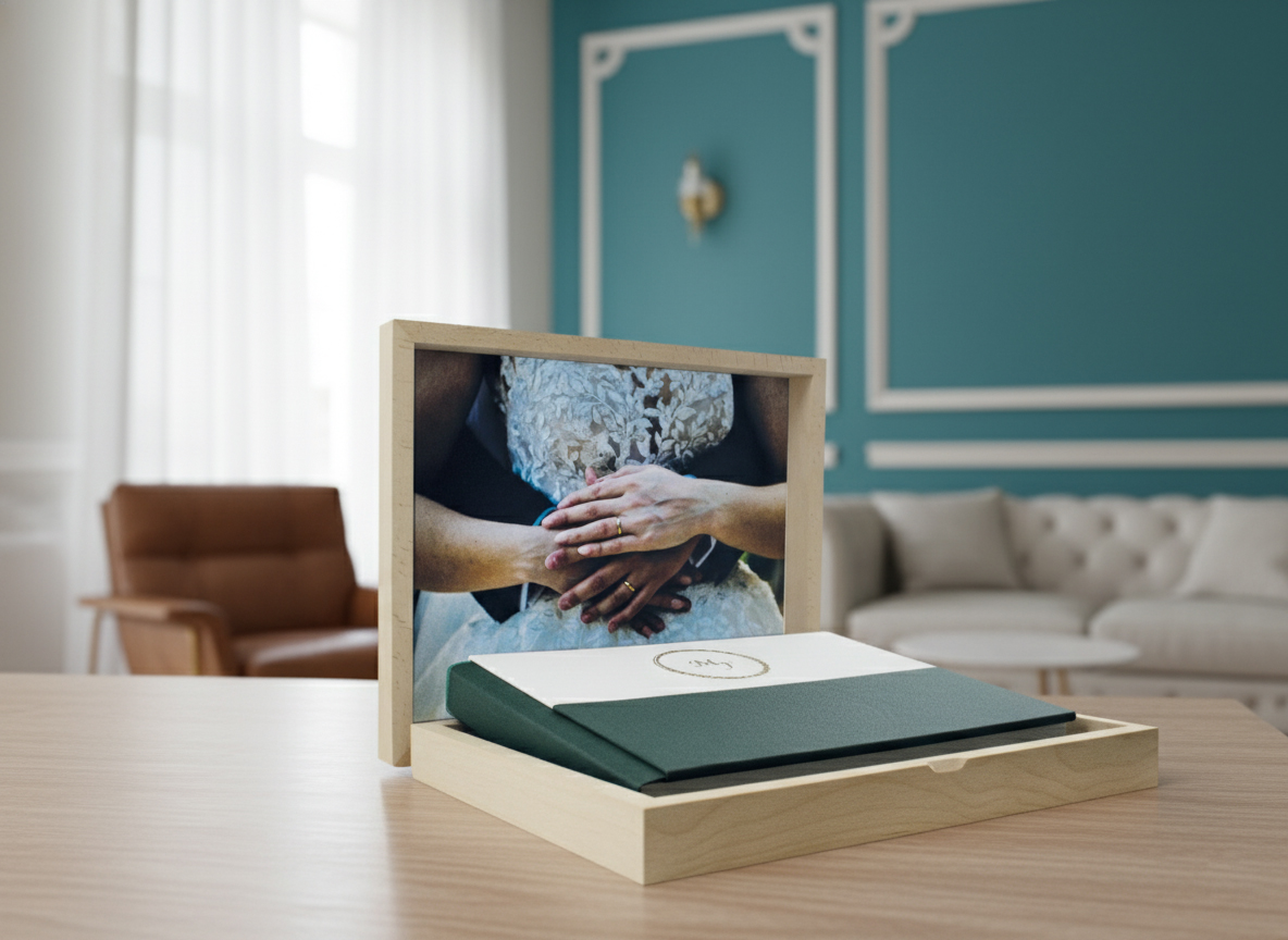 Questo elegante box per album di matrimonio è realizzato in legno chiaro, con un design moderno e funzionale. La scatola si apre rivelando al suo interno un album dal design raffinato. Il punto forte è il coperchio, che si trasforma in una cornice espositiva, mostrando una suggestiva fotografia della coppia di sposi. È un oggetto che fonde artigianalità e tecnologia, perfetto per custodire e valorizzare i ricordi più preziosi del grande giorno con un tocco di magia e intimità.