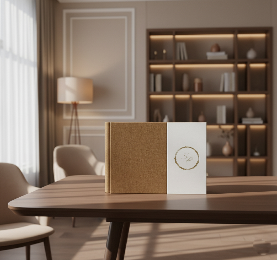 Questo album di matrimonio incarna un’eleganza sobria e raffinata, perfetta per custodire i ricordi più preziosi. La sua copertina presenta un contrasto armonioso tra un dorso e una parte principale in tessuto color beige, e una sezione verticale bianca. Su quest’ultima, le iniziali personalizzabili sono elegantemente incorniciate da un motivo circolare decorato, che aggiunge un tocco personalizzato e distintivo. È un oggetto dal design pulito e moderno, che unisce la semplicità con un dettaglio prezioso, ideale per celebrare un giorno speciale.