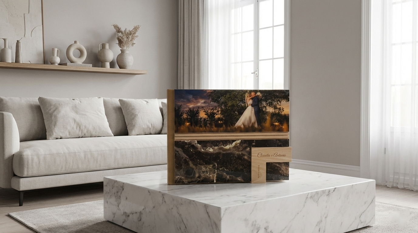 La copertina è divisa in due sezioni orizzontali: la parte superiore ospita una stampa fotografica in plex di alta qualità, mentre la parte inferiore presenta un elegante inserto con texture marmorea scura. A rifinire l’estetica, un elemento in legno naturale attraversa la copertina e si estende lateralmente con una placca personalizzata, dove sono incisi i nomi degli sposi personalizzabili .